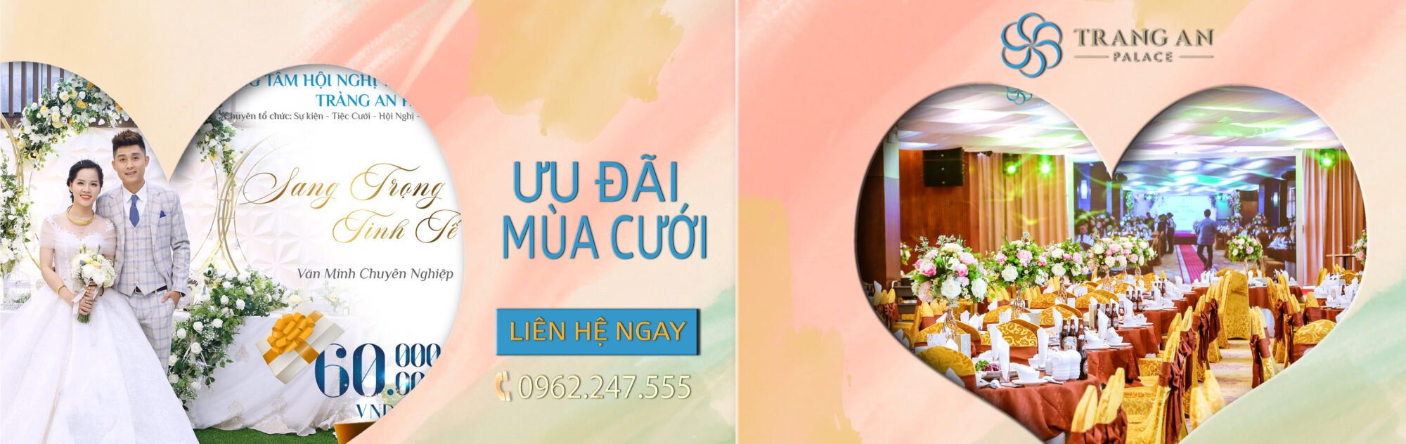 Là trung tâm hội nghị tiệc cưới hàng đầu với không gian SANG TRỌNG – dịch vụ CHUYÊN NGHIỆP – sản phẩm TINH TẾ – quản lý VĂN MINH. Hệ thống Tràng An cung cấp cho bạn những dịch vụ tiện ích bao gồm: Dịch vụ Tiệc Cưới, Hội Nghị – Hội Thảo, Sự kiện và Tiệc lưu động.